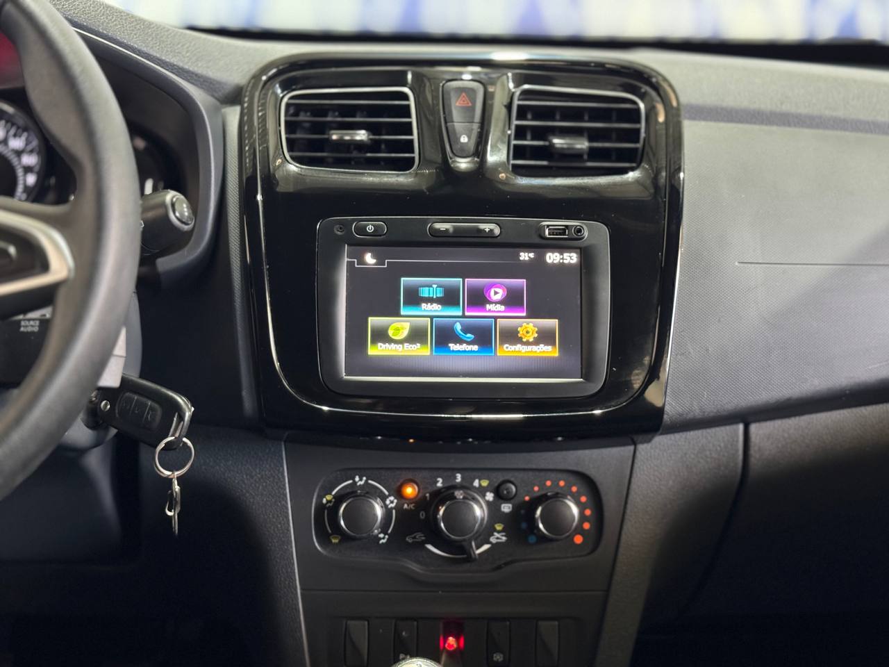 multimídia de fábrica, já integrada no painel, com conexão pro celular, Bluetooth. Volante já com detalhes cromados
